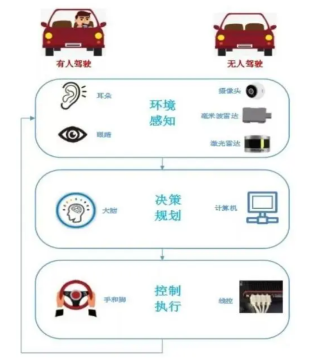 自动驾驶是一种使用计算机技术和传感器等设备使汽车或其他交通工具能够在没有人类司机干预的情况下自主驾驶的技术。基本原理是通过传感器(如激光雷达、摄像头、雷达等)实时感知识别车辆及周边环境(道路、交通标志、障碍物和其他交通参与者)等情况,再通过智能系统进行规划决策,最后通过控制系统执行驾驶操作。